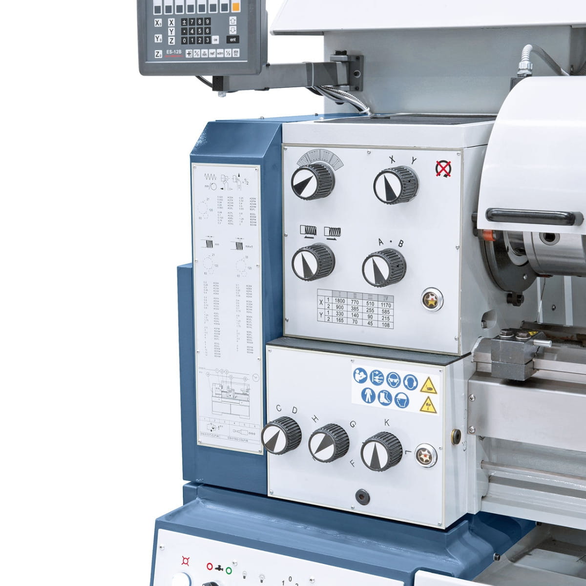 - Centralny układ przełączania posuwów i układu gwintowania ze śrubą pociągową i wałkiem pociągowym