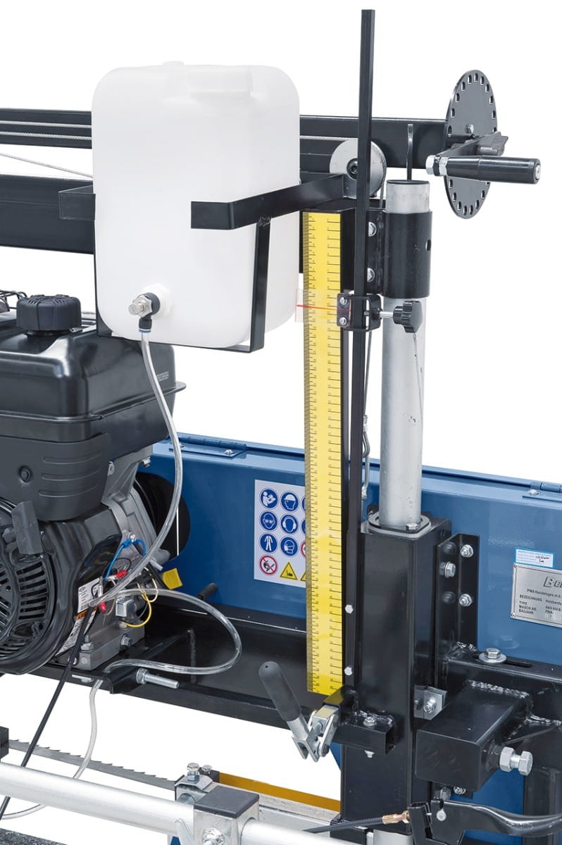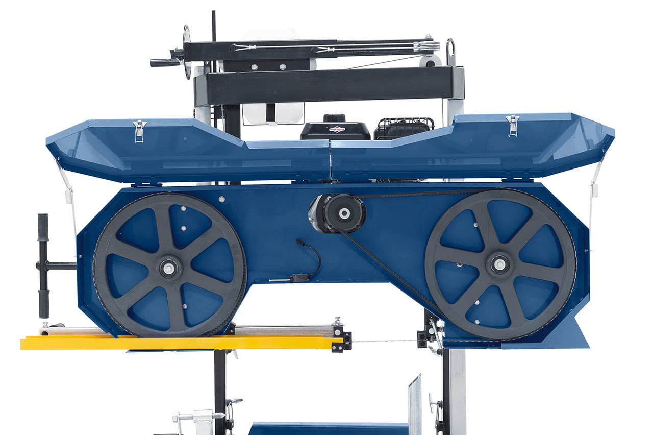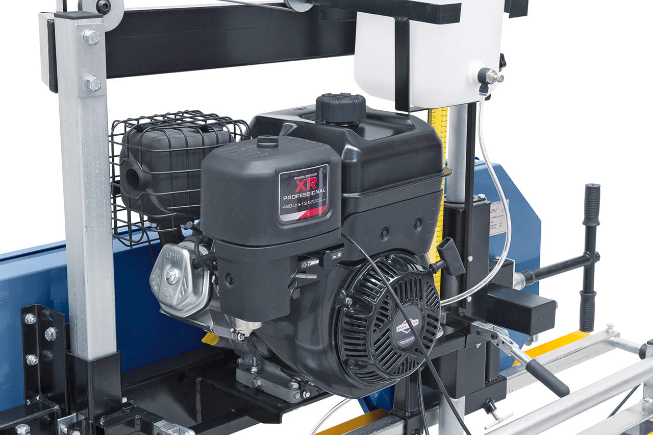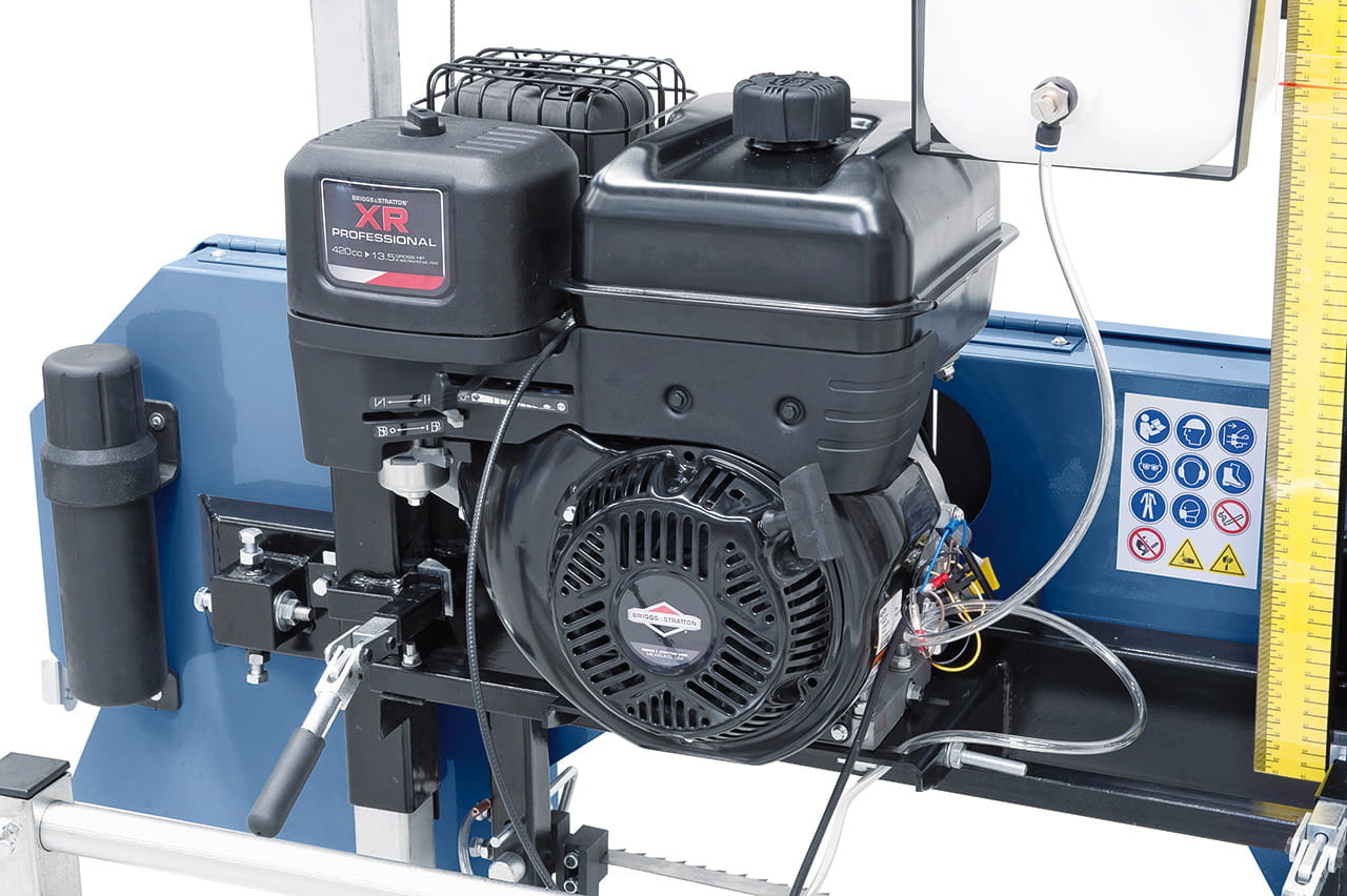 Wyposażony w piłę taśmową przeznaczoną do wzdłużnego piłowania, trak jest napędzany silnikiem benzynowym o mocy 10 kW.
