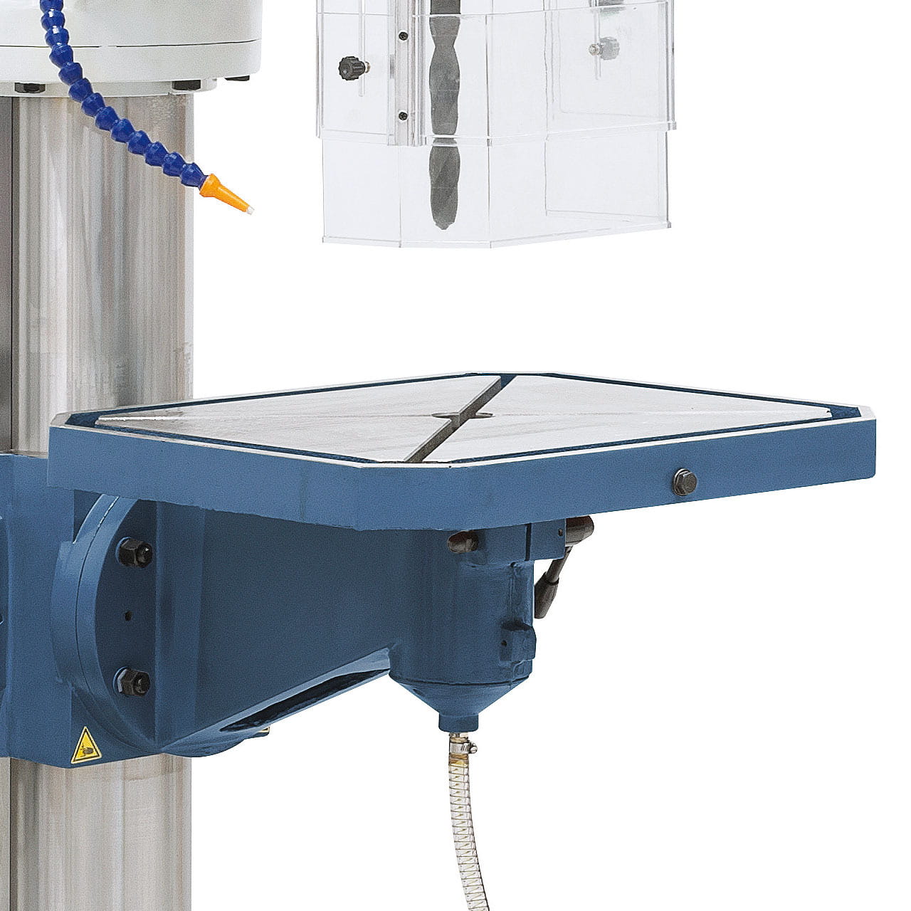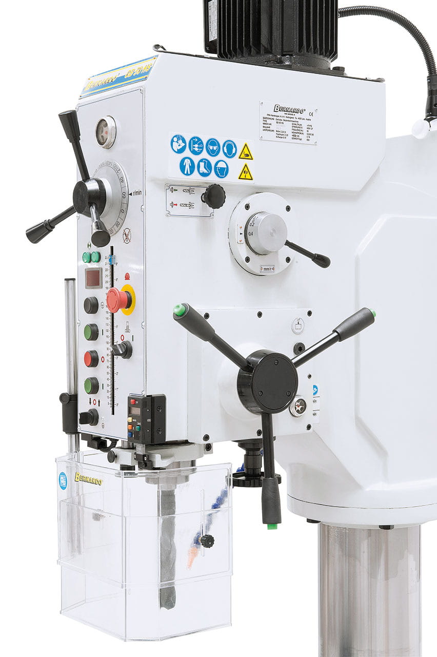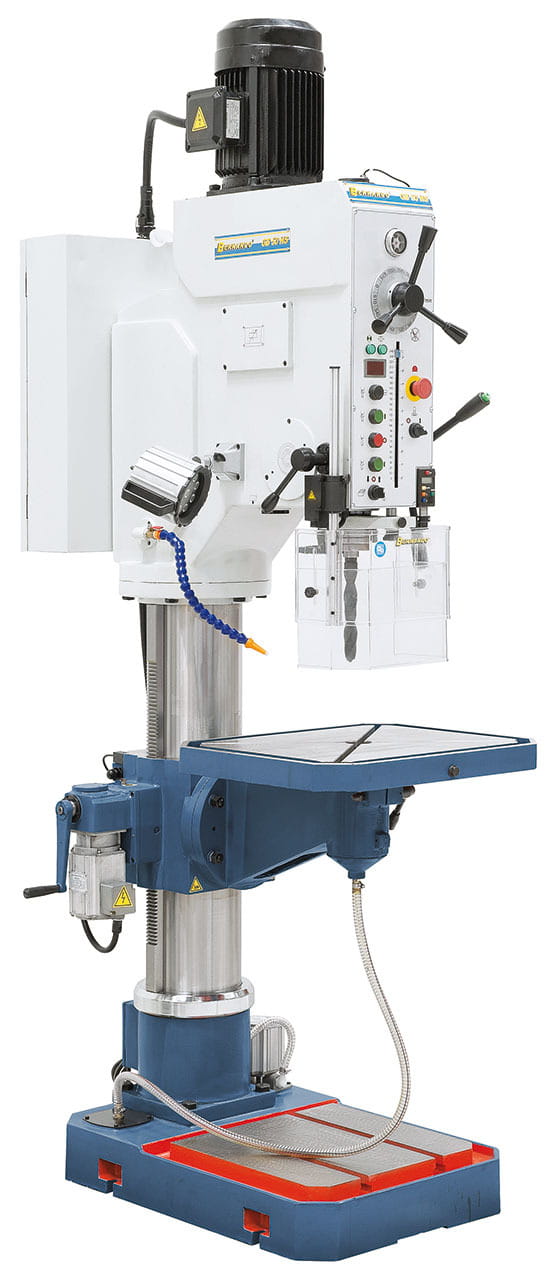 Automatyczny posuw wrzeciona, motorycznie unoszony stół, chłodzenie, oświetlenie LED, oraz wskaźniki głębokości i prędkości wiercenia są standardowym wyposażeniem.